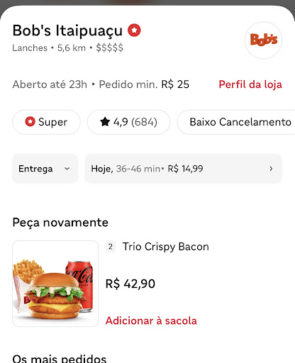 Read moreComida atende aos padrões da franquia Bobs. Ambiente e Higiene podem melhorar. Atendentes ainda inexperientes mas procurando acertar. Refrigerantes gelados e bem gaseificados em livre demanda. Semelhante ao Burguer King. Os molhos dos sanduíches também são de livre consumo. Loja inaugurada a pouco tempo mas tem grande potencial. Sempre compro. Seja pelo IFOOD ou indo até a loja e retirando. Não costumo...