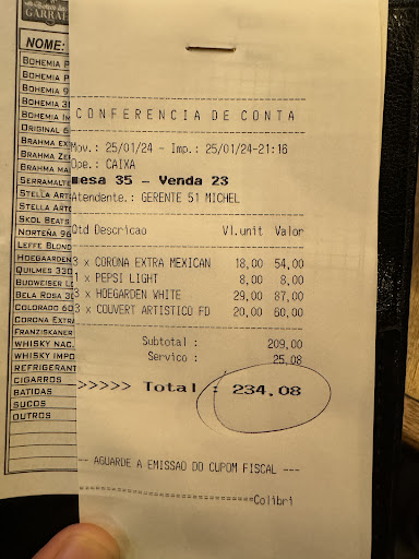 Wir sind durch Zufall dort gelandet. Das Restaurant hat einen Innenbereich und davor auch draußen einige Tische. Der Service war gut, die Kellner aufmerksam. Die Kleidung und das Auftreten der Angestellten sowie die Menükarten, eingebunden in Ledermappen, machten einen guten Eindruck, dass es sich dort um ein gehobenes Restaurant handelt. Da es sehr heiß an diesem Tag war (33 Grad) hatten wir nicht wirklich Hunger. Also entschieden wir uns nur für Suppe und schönes kaltes Bier. Es sind nicht immer alle Suppen verfügbar, die auf der Karte stehen..Während der Wartezeit auf's Essen, kamen immer wieder Kellner an den Tischen vorbei, die verschiedenen Sachen anboten. Vorspeisen, Likörchen usw. Wir haben dann jeder son großen, fritierten "Ball" gewählt, wobei wir nicht wussten, was das sein soll. Es stellte sich heraus, dass es so ne Art Fischboulette/Fischfrikadelle ist, wie man es ähnlich aus Deutschland kennt. Diese angebotenen Speisen sind keine Aufmerksamkeit des Hauses gratis, sondern landen hinterher auf der Rechnung, was einem zuvor aber nicht gesagt wird. Mein Mann hat eine Hühnersuppe gewählt mit Reiseinlage, ähnlich wie in Deutschland der Brühreis bzw Hühner-Reis-Eintopf. Meine gewählte Kürbissuppe gab es nicht, also entschied ich mich für grüne Erbsensuppe mit Würscheneinlage. Meine Wahl entpuppte sich als falsche Wahl. Es waren keine geschnittenen Würstchen, sondern viel, ich meine sehr viel ! gebratene Schinkenwürfel, was die Suppe extrem salzig machte. Sie war fast ungenießbar. Ich hab den Schinken zwar alles rausgesammelt, aber das salzige war ja in der Suppe verkocht. Was uns auch absolut nicht gefiel, im Innenraum des Restaurant spielte eine Liveband, die so extrem laut war, dass man selbst draußen sein eigenes Wort nicht verstand. Geradeüber im Restaurant war ebenfalls Musik, wir hatten den Eindruck, dass beide immer lauter wurden, um sich gegenseitig zu übertrumpfen. Wir mussten uns als Paar also anschreien , anschweigen oder mit Zeichensprache artikulieren. Es war absolut anstrengend und kein gemütlicher , entspannter Abend. Als wir uns setzten, spielte keine Musik, entweder hatten sie Pause oder bauten gerade erst auf, sonst hätten wir uns dort gar nicht erst niedergelassen und bestellt. Als die Rechnung kam, waren wir überrascht, dort waren pro Person 20 Rais (also 40 zusammen, das entspricht etwa 8€) für die unsagbar laute Musik. Es wurde nirgendwo darauf hingewiesen !!! Absolut nicht in Ordnung. Aufgrund der hohen Kriminalität in Rio laufen wir nur immer mit einem bestimmten Tagesbudget an Bargeld in der Gegend rum und lassen Kreditkarten im Safe. Wenn man von den zusätzlichen Gebühren für die Musik nichts weiß, kann die Rechnung schon mal eine Überraschung werden..Schilder sollten auf die Musik und zusätzlichen...