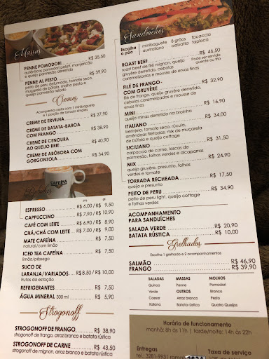 Read more(Edição de 19.02.2020). Minha primeira impressão sobre o Cafeína foi bastante negativa (principalmente quanto ao sabor do mate da casa e os preços elevados - nesse aspecto, em particular, eles têm praticamente um monopólio, pois os entregadores de outras empresas não podem subir até os quartos e nem sempre há alguém disponível para buscar a comida na recepção). As circunstâncias, porém, me fizeram cliente assíduo e pude observar que há um cuidado especial com o consumidor: a administração é bastante flexível quanto às demandas e estou bastante satisfeito com o atendimento prestado. As opções do menu são variadas e compreendem desde um lanche rápido até uma refeição completa. Dos pratos que provei, tenho uma predileção pelas tapiocas. Somente sugiro uma reformulação do strogonoff de carne, pois achei a...