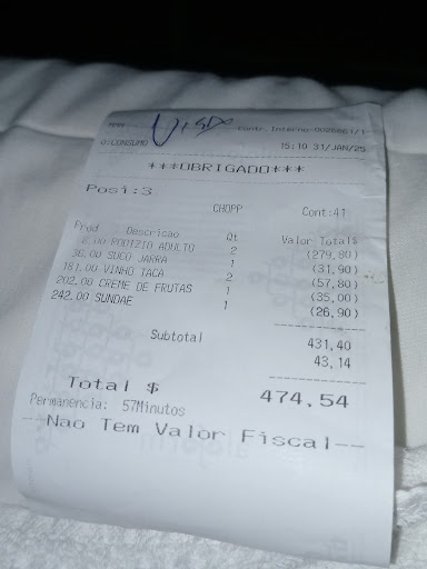We were approached by a man who showed us a very good price on a billboard of about R$25 each for two at lunchtime for a buffet lunch. We followed the man and were seated and several appetisers were presented before we had time to think. An hour later they gave us the bill R$475 for two for lunch. The lunch was a buffet with 8 snall servings of meat and we had desert and one of us had 2 glasses of wine. The amount of meat that we consumed was not large as one of the two of us is vegetarian. It looks like each time we were given small portions of meat we were charged almost R$40. Long story, short we got ripped off today because we were stupid. Lesson learned!