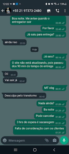 Read moreVamos lá. Pedido pago 8:51 da noite, recebi agr às 23:20, mas só pq eu tive q sair da minha casa para ir procurar o entregador, e ainda tive q ligar pra ele, paguei taxa de entrega pra que mesmo??? Segunda coisa, pra fazer seu pedido são otimos, dpois q faz eles esquecem que voce existe, fica online e nao responde uma mensagem sua pra pelo menos explicar o porque dessa demora de quase 3 horas!!!!!!! Eu fiquei altamente decepcionada e muito, muito pu@@ da minha vida por ter todo esse estresse! Se eu pudesse dava ZERO!!!!! ALIAS...