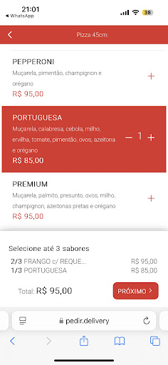Read moreNota 1 pois não é possível dar zero. Segunda vez que faço o pedido e eles não percebem o mínimo pra fazer uma pizza da maneira que pedimos, pedi duas vezes claramente, uma por telefone e outra pelo aplicativo deles, que eles fizessem uma pizza 2/3 frango e 1/3 portuguesa, as duas vezes me entregam meio a meio e agem como se nada tivesse acontecido e não fazem nada para resolver. Não recomendo pra quem não quer se estressar, péssimo serviço. Muito caro para ser atendido como porcos, como se eles tivessem nos...