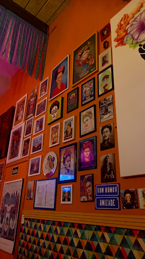 O ambiente é lindo, muito colorido, com várias fotografias e pinturas da Frida Kahlo, música brasileira tocando na TV como Alcione, Silva, Maria Betânia, Gal e toda essa galera.