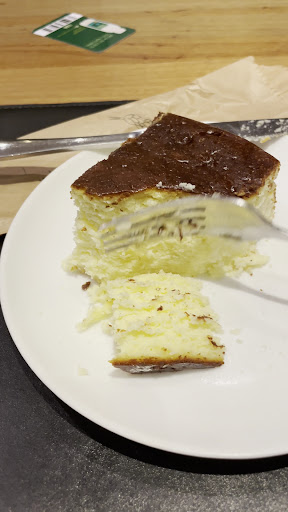 Na sequência, já trouxe a fatia de torta basca. Infelizmente não era boa, inclusive a aparência enganava, paguei R$ 16,90 nela. Diferente de tantas outras que já comi, ela foi servida fria e estava com a textura firme a ponto de estar esfarelenta e quebradiça, como se estivesse cortando um queijo ricota. Porém em sabor estava boa, nada surpreendente.