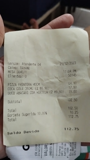 Read moreAs 22 hs entrei no restaurante Solicitando a segurança ou gerente do local perguntou se seria rodízio pois o rodízio estaria encerrado somente a la carte .Disse que gostaria de servico a lar carte e mesa para 4 adultos e uma crianca Me negaram a cadeira para crianca Que tinha 2 anos Entao a funcionária disse que poderia entrar que teria mesa reservada . Cheguei ao garçom e solicitei a mesa que estava sendo preparada . Disse que nao tinha mesa para atender que fosse procurar a praca de alimentação Falei que tinha solicitado a mesa a la carte que a funcionária indicou Me olharam de cima a baixo e falou nao tem pizza da promoção nao . Tem dinheiro para pagar ? Disse que tinha . Que iríamos comer Então veio outro garçom e jogou o cardápio e falou quando souberem o que queriam comer . Me avisem Escolhemos o que queria . E solicitamos o garçom . Comemos tudo bem . Quando chamei o garçom e ele veio e falou nao vou atender mais pq nao tem atendimento pra voces aqui . E o pizzaiolo ainda gritou tira esses mortos de fome que pq nao tem pra pobre Solicitei o gerente reclamei da situacao e o mesmo disse que nao poderia fazer nada que se retirassem e pagassem a conta e o servico péssimo do garçom que tive. Cheguei ao caixa a atendente cujo nome se identificou por Rayanne perguntou se tinha condições de pagar . Falei que a obrigação dela e perguntar a forma de pagamento . Paguei e sai do local Sinceramente nao pretendo voltar nunca mais a uma unidade do Frontera era primeira vez que entrei achei péssimo e nao gostaria de ser tratado novamente desse tipo prefiro nem passar na porta . Pizza fria , péssimo atendimento humilhando toda...