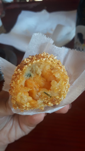 Probably one of the best coxinha I've ever had (sorry, not the one pictured - it was so good I didn't have time to record). So, they have a coxinha (traditionally a coxinha is a tender mashed potato dough filled with chicken) but this one was made with Arracacia xanthorrhiza, seasoned chicken and a piece of plantain. Totally delicious. It's called "Galinha Chic". They also had one with cornmeal dough, filled with shrimp and cheddar (pictured) really good too! So many more to try with a ice cold beer. I could stay here the whole day just eating their "comida di buteco" (food/snacks/finger food you est at a bar while drinking beer). If you're in Rio, I'm a local guide here. Feel free to get in touch with me through any social...