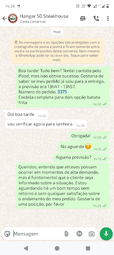 Read moreInfelizmente, a qualidade do atendimento deste restaurante caiu de forma drástica. Já foi uma das minhas opções favoritas, mas as últimas experiências têm sido decepcionantes. O meu pedido teve 1h de atraso, e o que mais me incomoda não é apenas o atraso, mas a total falta de respeito e consideração com o cliente. Não houve nenhum tipo de posicionamento ou justificativa, nem pelo iFood, nem pelas mensagens diretas. Fiquei aguardando sem qualquer retorno, me sentindo completamente ignorada.