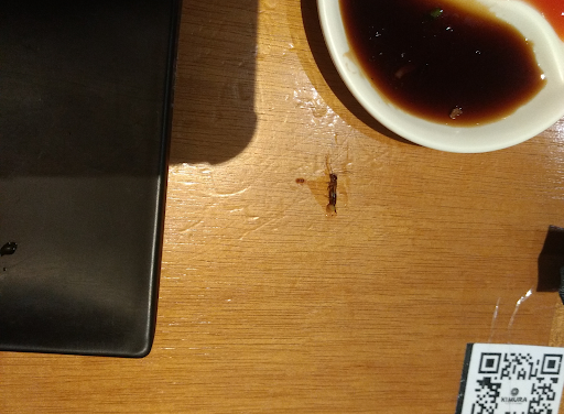 No entanto, para minha surpresa e desagrado, me assustei com um inseto se movimentando embaixo da vasilha do molho teriaki/agridoce. A princípio vi pela visão periférica e quando olhei diretamente pude confirmar que era um bicho longo que até hoje não sei especificar qual. Mexi a vasilha para que ele saísse de lá, foi quando ele começou a andar na mesa e consegui mata-lo com o papel do pacote de hashis (foto em anexo).