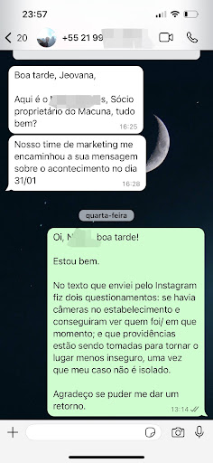 Alguns dias depois recebi um alô no Instagram solicitando meu número. Pelo que entendi, um dos sócios entraria em contato comigo. Imaginei que esclareceria toda a situação. Um dos sócios realmente me deu um “oi, tudo bem?” no WhatsApp. E ficou por isso mesmo. O sujeito não falou mais nada!