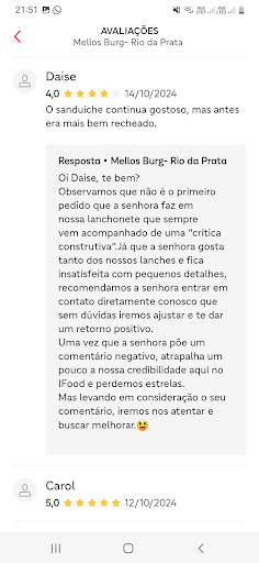 Péssimo atendimento! O pedido veio faltando e um dos hambúrgueres veio só o cheiro do cheddar e do alface(tenho foto p provar). O entregador n quis nem entrar até o pátio do condomínio. Enviamos uma msg reclamando com a foto do hambúrguer e só responderam “salada é só o alface”. Então fomos ao local, cheguei educadamente devolvendo o pedido, o dito cujo(q eu ja suspeitava q era o q tinha respondido pelo wpp) mandou chamar uma mulher. Ela veio e me questionou sobre o por quê da devolução. Expliquei, e ela n satisfeita, mas até então educada, disse q era p eu ter pedido mais salada quando for assim. Eu disse q então a pessoa q respondeu ao wpp poderia ter explicado e n simplesmente ter dado uma resposta fria como “salada é assim msm” (minhas palavras). Eles aproveitaram minha fala p tentar invalidar a questão principal. Independente da palavra usada, ele assumiu q é grosso, então eu n estava errada na minha interpretação. Se a pessoa so responde “salada é só o alface” e n diz mais nada (sendo q nem perguntei o q era salada), eu entendo q ela n quer resolver o problema, então eu q fique com o hambúrguer do jeito q ta pq “salada é só o alface”. E no final ele ainda me acusou de estar dando golpe( os hambúrgueres estavam intactos). Quando comecei a gravar ele n repetiu mais. Ele estava alterado e foi extremamente machista. Disse ao meu companheiro q n me levasse na próxima vez, q “coisa” de homem se resolve entre homem (tenho video). Sendo q quem fez o pedido e pagou foi eu. Foi machista e desrespeitoso. N serve p trabalhar com o público. E n tive a oportunidade de mencionar q no ultimo pedido o suco de abacaxi veio passado! Mas acabei deixando p la, no dia. Péssimo...