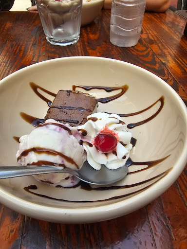 A sobremesa também é padronizada, mas bem interessante. Um pequeno brownie recheado com doce de leite acompanhado de uma bola de sorvete de frutas vermelhas e uma calda de chocolate. Em retrospecto não sei dizer se o sorvete é sempre o mesmo sabor, mas achei muito bom o de frutas vermelhas. O brownie é brownie, gostoso, não tem como errar.
