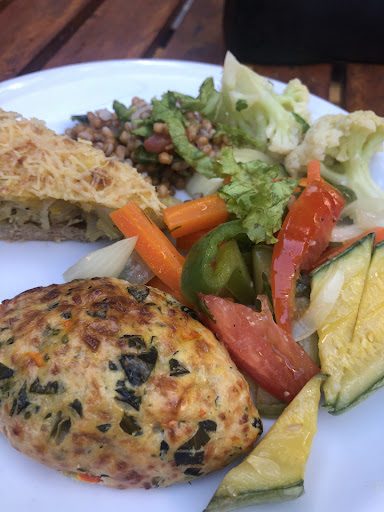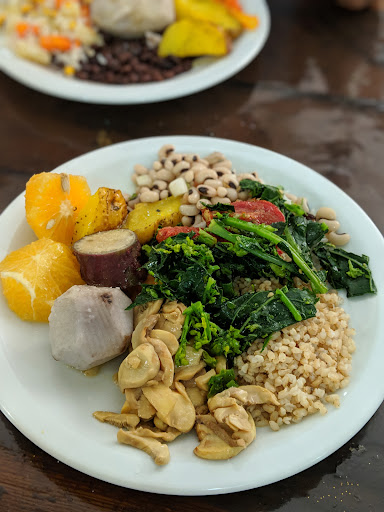 A pay by weight vegetarian buffet contains salads, soups, & sushi & a health goods shop.