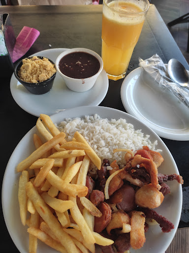 Embora o churrasco misto estivesse com aspecto bem gorduroso e seco, estava até gostoso. Conforme fui comendo, achei um pedaço de plástico no meio da comida, acho q veio no arroz, parecia uma fatia de cebola, eu relevei. Deixei de lado e continuei comendo. Até que mordi um pedaço de frango com gosto de estragado, tentei continuar mastigando, mas era intragável. Desisti da comida. Pedi pro garçom chamar o gerente. Após uma demora de 5 minutos, ele veio e eu contei a ele todo o relato da minha experiência. Ele disse que iria trazer outra coisa pra mim, perguntou o que eu queria, eu perguntei o que estava fresco, ele me ofereceu frango grelhado. O frango veio 24 minutos depois e sem a farofa. Eu não pedi mais nada, ele até ofereceu gelo pro meu suco de laranja que já estava pra lá de quente, mas eu disse que não precisava pois eu só queria sair de lá. Terminei de almoçar e saí de lá bem insatisfeita. Achei o ambiente caótico, tumultuado, nem diferente de todas as vezes que fui lá. Infelizmente a experiência hoje foi ruim e traumática de um jeito que realmente não pretendo voltar. Nem na hora de pagar consegui alguém pra fechar a minha conta, cansei de ficar ali, me levantei e fui eu mesma ao caixa.