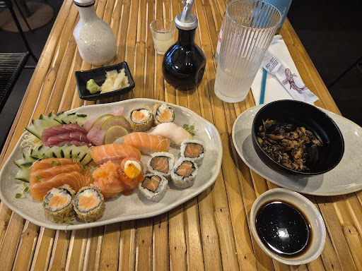 Intimate restaurant with décor featuring Japanese art, serving Japanese food with a Brazilian touch.