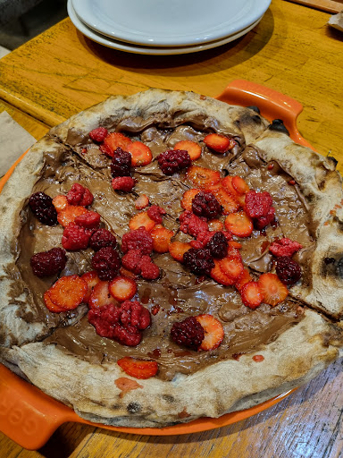 Pra finalizar, pedimos uma pizza doce de frutas vermelhas (R$55), que também estava bem saborosa! Único ponto que sugeririamos seria de o chocolate ser quente, pois as frutas já são frias, acaba que a pizza fica gelada, então não torna a experiência das melhores.. Mas o sabor estava incrível