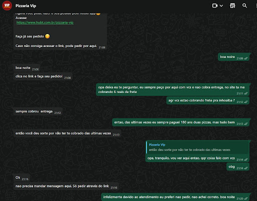 Read moreSempre comi nesta pizzaria, mas parece que mudaram os atendentes, e o atendimento foi péssimo o cara não me deu atenção nenhuma, primeiro liguei como de costume pelo telefone e depois ele me pede o meu zap pra passar os cardápios ate achei legal e tal, só que fiz as perguntas e ele mal me respondia no zap, me deixava minutos sem me responder, pois bem fiz o pedido as 21:31 e só as 21:59 me responde perguntando se eu iria querer a pizzaria? Só ai já tinha perdido a fome. Disse não! Tenha uma boa boite. Perdeu...