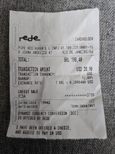 When paying the bill, I clarified that I wanted to pay in Brazilian Real. I found it odd that the server removed the payment terminal from the table and when he handed me the receipt, I noticed that they applied dynamic currency conversion and charged my card an extra 12% to convert to USD. I asked the waiter to change it to Real and he insisted that he did charge me BRL. I showed him the reciept displaying the charge in USD and the extra 12% markup. He again insisted that I was charged in BRL and refused to fix the issue. Very disappointing that a restaurant resorts to these types of tactics to make additional margin on their sales. I would strongly recommend that tourists stay away unless they plan on being charged an extra 12%...
