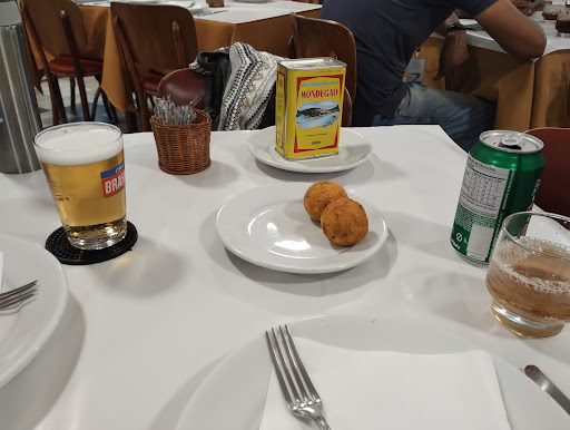 Read moreRestaurante muito tradicional e com uma vibe muito familiar. Fica localizado na praça conhecida como praça dos cavalinhos, com muitas árvores e ar de tranquilidade. O restaurante possui um ambiente agradável e com uma decoração que remete à Portugal. O serviço é rápido com uma equipe de garçons muito simpáticos. O carro chefe da casa com certeza é o bolinho de bacalhau. Servidos bem quentinhos e com bacalhau de vdd. O tempo todo passava uma bandeja cheia deles. Pedimos de prato principal, o risoto de camarão. Também gostamos. Só sentimos falta de um queijo parmesão mais fresco e cremoso, já que no preparo dele, não é adicionado o queijo. O queijo parmesão que foi servido à parte, era daqueles já endurecidos com aquela textura tipo pó. De sobremesa, pedimos pudim de leite e creme de ovos moles de Aveiro. O destaque, sem dúvidas, foi para a entrada...