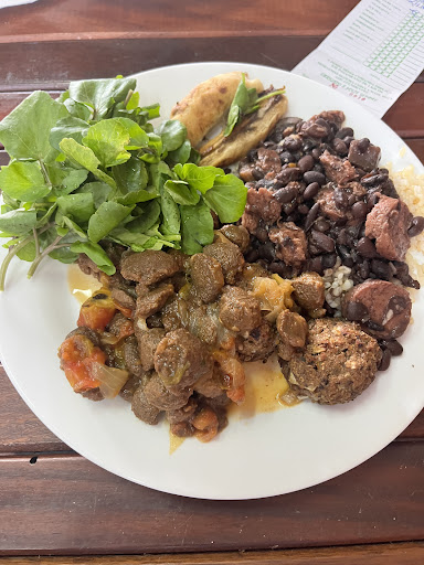 Read moreO peso é de 55 reais o quilo, mas não se engane, é bem caro. O meu prato deu 39,60 só colocando 1 colher grande de arroz, 1 concha pequena e meia de feijoada vegetariana, 1 colher grande de farofa de cebola, 1 colher pequena de salada, 1 colher pequena de molho shoyu e cebola, 3 pedaços pequenos (1/4 do tamanho da palma da mão) de kibe recheado com tofu e espinafre e 1 colher pequena de molho de mostarda. Isso daria tranquilamente 25 reais em um restaurante não-vegetariano com a mesma pesagem. Mas a comida é razoável, então se você é do time de veganos/vegetarianos com grana, vai gostar. É um almoço rápido, e o restaurante estava vazio em pleno meio dia de uma sexta. Se você for um vegano pobre como eu, coma com bastante moderação! 😂 O mais surreal é que a comida é extremamente simples, a variedade é bem menor, se comparada a comer num restaurante não...