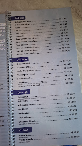 Nós provamos e adoramos: Pastéis de camarão R$ 8,90 u Cebola recheada com camarão (incrivelmente deliciosa) R$ 16,90 Camarão empanado R$ 49,90 Anchova na brasa com camarão R$ 89,90 Acompanha batata sauté e arroz de brócolis. Aquários de frutos do mar R$ 159,90 Chapa de frutos do mar com salmão, linguado, polvo, camarão e lula acompanhados de arroz branco e pirão. Banana na brasa R$ 14,90 Servida com sorvete e calda. Drinks R$ 23,90 Provamos a batida de frutas vermelhas com leite e a de maracujá sem leite.