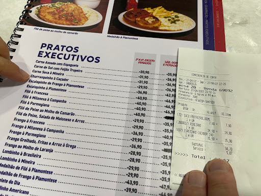 As you can see in the photo I uploaded of the receipt and menu, they billed us R$35,99 for the R$29.99 dish we ordered, Churrasquinho à Caçador, which is the dish we got. The receipt claimed we got Espetinho Cacador. We know that we did not order this because no such dish exists on the menu.