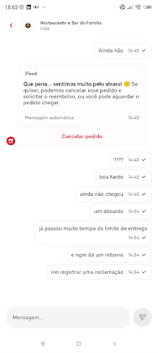Read morese fosse possível dar menos de uma estrela eu daria fiz o pedido no delivery o pedido e leva mais de 3h00 para ser entregue, uma demora para resposta do restaurante não tem resposta do entregador onde está o seu pedido não recomendo quem for pedir lá prefiro pagar R$10 em outra comida e não gostar do que fazer um pedido desses e ficar 3h00 esperando para poder receber minha comida.. Recomendo que todos que for pedir não optem por esse restaurante pois vão ficar com fome durante 3h00 ou mais. Aparecem até comida de boteco pode parecer boa porém a entrega e atendimento pós pedido é horrível então Do que vale aparecer na comida de boteco com delivery tão...
