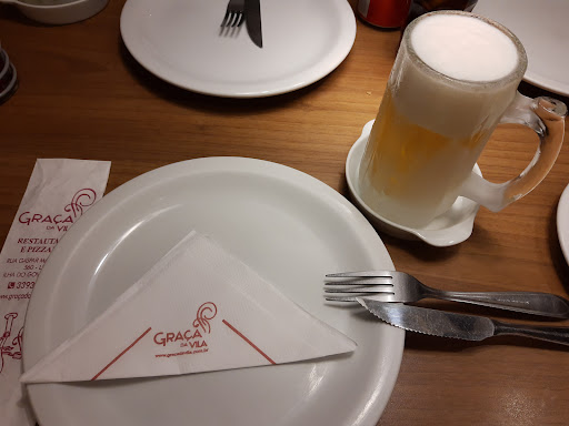 Read moreAmbiente climatizado. Decoração exagerada, com milhares de bandeiras do Brasil e Portugal, de vários tamanhos, me senti em período de Copa do Mundo. Muitas mesas e a passagem entre elas era estreito, insuficiente para a circulação dos garçons. Rodízio de Pizza a 25 reais, achei bom preço. Porém, também havia pratos a la carte, mas considerei muito caros. Pizzas gostosas, chegavam quentinhas, mas pela casa lotada não eram servidas com rapidez e variedade. Os garçons passavam muito rápido a ponto de eu não perceber que tinham passado em vários momentos. Comi só 5 pedaços. Pedi um suco de laranja que demorou muito tempo, então fiquei com muita sede comendo sem beber. Depois do suco, mais pro final da noite, estava de novo com muita sede e queria pedir uma água, mas não havia para quem pedir. Se o serviço fosse mais atento ou com mais funcionários, com certeza eu teria consumido muito mais bebidas. Acho que o restaurante deveria diminuir a sua lotação para o serviço melhorar. Antes de ir embora, fui ao banheiro e seu estado estava lastimável, o que seria explicado pela grande quantidade de pessoas. Porém, considero que não há justificativa, deveria haver um funcionário que assegurasse a limpeza do local durante o funcionamento, esvaziando o cesto e secando o chão, higienizando e principalmente neutralizando os odores.