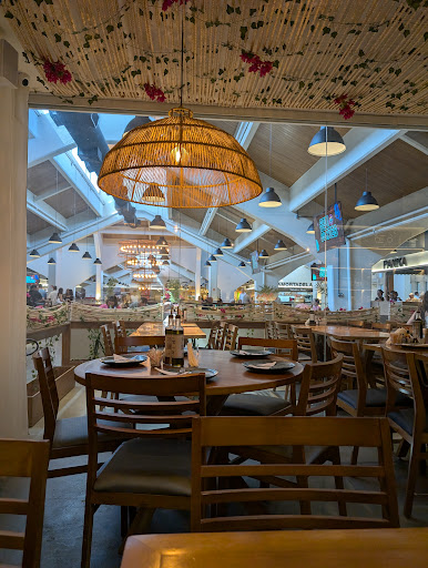 Read moreFui semana passada com a minha mãe almoçar nesse local tão elogiado pelos influencers da cidade. Chegamos por volta de 11:30h pra conseguir lugar, os restaurantes abrem a partir das 11h, e o horário de almoço no sábado o mercado fica cheio. Fica a dica. Local apertado e ainda colocaram um vaso enorme de planta artificial no meio do salão e mais mesas do que realmente cabe um remanejamento de mesas seria importante. Pelo menos tinha um bom ar condicionado. Recomendo ao estabelecimento RETIRAR IMEDIATAMENTE o suco de caju do cardápio pq o que chegou na nossa mesa não passou nem perto disso, era mais uma água suja com um caju amassado no meio sem gosto de nada e cheio de gelo. Depois que minha mãe reclamou do suco no fechamento da conta não cobraram (tiveram esse bom senso). Apesar de estar no cardápio não tinha suco de laranja pq o garçom que anotou nosso pedido deu uma desculpa qualquer e sem sentido pela falta dessa opção, pra quem curte sucos naturais a casa está bem ruim no assunto no cardápio tem poucas opções. Pedimos o Camarão Sagrado Mar, serve até 3 pessoas que comem pouco, demorou cerca de meia hora para chegar a nossa mesa. Não cobraram pela embalagem de viagem. Serviço médio, não tem maquininha de anotar o pedido e pagamento para todos os garçons. As mesas não são divididas entre os garçons, todos atendem todas as mesas o que gera uma certa confusão, vimos alguns garçons claramente perdidos rodando entre as mesas apertadas. As mesas são limpas depois de ficarem vagas. Vi indicação no Instagram mas pensaria em outras opções antes de voltar caso não mudem algumas questões. Para restaurantes tem outras opções no mercado mas pode até valer a visita em um horário menos cheio talvez até...
