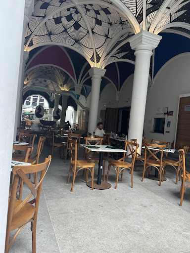 As mesinhas da área coberta ficam ao lado do teatro, entre as icônicas colunas do casarão, sob o estiloso painel de Rafa Mon.