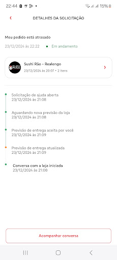 Fiz um pedido pelo iFood as 21:45h, cujo prazo máximo para entrega era 23:03h. O pedido saiu para entrega 22:16h, e não foi entregue, mesmo estando pago. Até entendo que problemas acontecem, mas é inadmissível que o restaurante não coloque um telefone válido no aplicativo para entrar em contato e/ou que não responda ao chat. Tentei entrar em contato também pelo telefone da loja, mas me foi passado que não era possível saber informações de pedidos feitos pelo iFood. Pra finalizar, tentei cancelar o pedido no app e o restaurante recusou o cancelamento. Fiz questão de fazer essa avaliação, apesar de não ter o costume, pois achei um enorme descaso para com o consumidor, e na esperança de que a loja tome providências para evitar que outros passem pela mesma situação...