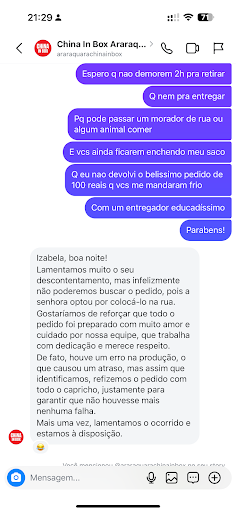 Adoro TDS os pratos do chinainbox, e a loja de Araraquara está de parabéNS. Porém hoje 18/07/2023 fiz meu pedido, aguardei ansiosa pelo meu boow favorito e qual foi minha surpresa ao receber uma comida fria, um arroz de fundo de panela, não tinha como mastigar pois estava duro, arroz quase branco pois, cenoura, presunto, ovos e etc quase não se via. O frango estava murcho e frio tbm, e o molho maravilhoso simplesmente "sujou" um dos pedaços do frango e só. Minha decepção foi terrível. Nunca provei nada tão ruim. E olha, eu como chinainbox desde que foi inaugurada aqui em Araraquara . Resumindo, foi tudo pro lixo. Que pena, eu espero que tenha sido apenas um mal dia de quem montou meu box, pq sinceramente vou pensar duas vezes antes de...