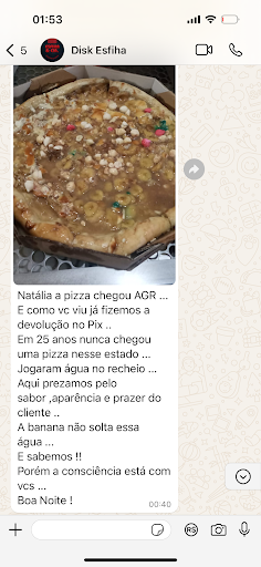 Read moreNa sexta feira estive no estacionamento com alguns amigos que vieram do MS, eles amaram a esfirra de banana caramelizada. Com isso, no sábado a noite resolvemos pedir a pizza para entregar em casa. Ao chegar, para nossa surpresa, a pizza estava completamente destruída. Imediatamente ligamos no estabelecimento, e solicitamos a devolução do valor e a retirada do produto, o que foi feito. Passado alguns minutos, recebi uma mensagem do estabelecimento insinuando que havíamos jogando água na pizza!!!! Um absurdo, por qual razão faríamos isso?? 23:30 da noite!??? Fazendo essa avaliação para que o estabelecimento se retrate acerca...