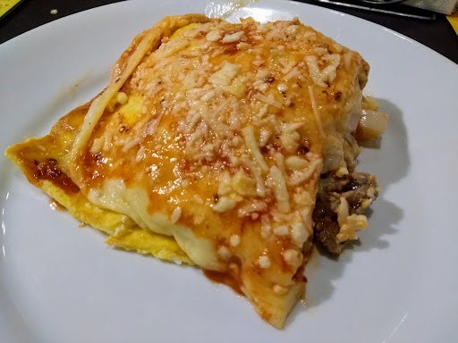 A decoração do lugar é muito bonita, bem rústica o que é uma atração. Pedimos a tradicional omelete, uma de carne mineira e a outra siciliana. Cada omelete serve duas pessoas se não estiver com muita fome. Fomos na segunda feira comemorar o aniversário da minha prima e tinha mais 3 grupos fazendo a mesma coisa. Enfim é um bom lugar para ir com a família 🤗