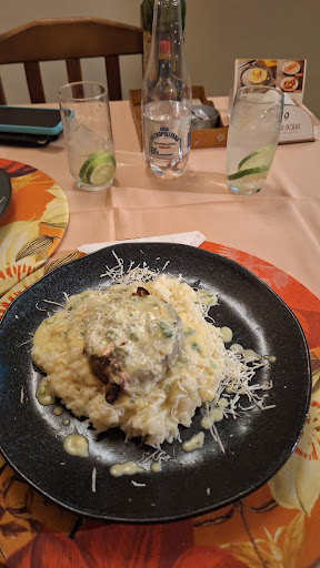 Uma refeição saborosa! Uma apresentação simples, mas com detalhes que se revelaram nas garfadas. 🎯 Escolhi a lasanha de berinjela com salada caprese 🔝, uma decoração diferente...😬 Os outros dois foram risotos com salmão bem saborosos, escolha certa também.🙌🏻 O ambiente é bem montado, mas a visibilidade para chamar o atendimento fica um pouco prejudicada pelas paredes, dava até para ter bebido mais umas doses. 😅 De sobremesa banana flambada e papaia com cassis fechando a experiência. 👍🏻 É uma ótima opção para uma refeição saborosa e mais acessível que outras opções da cidade. ⭐Foi assim na minha visita! custo⭐⭐⭐⭐ Benefício...