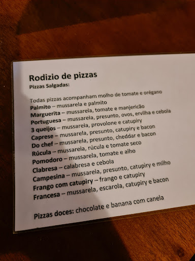 Read moreDe tão ruim é péssimo! Atendimento falho e mal educado, participei do rodízio e pedi explicação do que eram as pizzas, a garçonete disse "está escrito no cardápio na mesa", falta de vontade e cordialidade. Nada compensa nesse lugar, fuja. Aparência engana pois parece ser um bom lugar, porém as pizzas são péssimas, ingredientes de baixa qualidade, queijo horrível parece aquele queijo tipo processado e não mussarela de verdade. Quando chegou a hora das pizzas doces, solicitei troca do prato pois o mesmo estava sujo e pasmem a moça disse que não pode trocar o prato no rodízio (???) Questionei o motivo e ela disse que segue ordens. As bebidas são a vontade porém não inclui água (???) Sem entender de novo por ser a mais simples bebida. São servidas em jarras com gelo o que fazem ficar aguadas e perder o gás, a solução individual (lata ou ks) é muito melhor. Resumindo falta tudo, preparado da equipe, qualidade dos produtos e atenção com os clientes. Tudo horrível! Foi minha primeira e última vez! Recomendo que você não perca seu tempo e dinheiro...