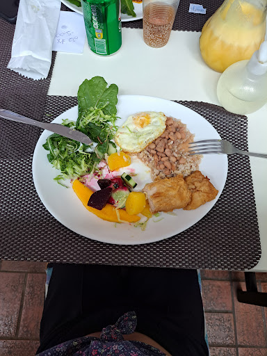 Consegui montar do meu jeito (lá tem um self-service com boas opções, inclusive pra quem não come carne ou come só peixe) Então não passamos fome, ENCHEMOS o prato! Kkkk 🥰🤣 Ambiente tranquilo e acolhedor