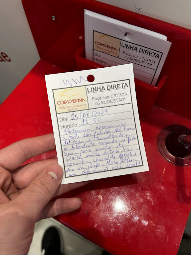 Ah, e tem um lugar para críticas e sugestões que eu amei, deveria ter em todo restaurante, ainda mais partindo do estabelecimento, vemos a busca pela melhora nesses simples atos, muito bom. Deixei meu recadinho.