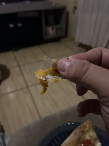 Boa noite, comprei uma pizza de frango com cheddar, e veio um pedaço de plástico em um dos pedaços.