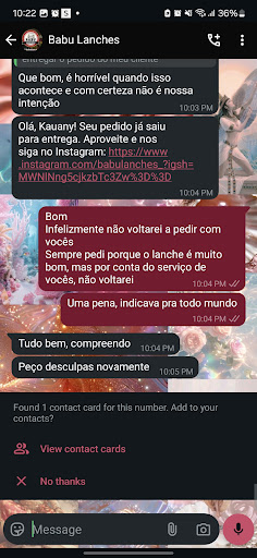 Read moreQue passar raiva e fome? Peça pelo iFood! Fiz meu pedido às 20h30, com previsão de entrega até 22h04. Fui informado sobre o atraso e questionado se gostaria de continuar com o pedido. Decidi aguardar mais 30 minutos, aceitando a prorrogação do prazo. Mesmo assim, o pedido atrasou novamente. Esperei até as 23h, quando não consegui mais aguardar e solicitei o cancelamento. Por volta das 23h20, o motoboy aparece no meu portão. Ele ofereceu a opção de eu ficar com o lanche pelo mesmo valor que constava no iFood. Porém, ao ligar para a loja para informar da minha decisão, a atendente foi bastante rude. No final, acabei ficando com o lanche, porque quase meia noite eu não acharia mais muitas opções. O lanche é bom, mas a experiência com a entrega e o atendimento foi...