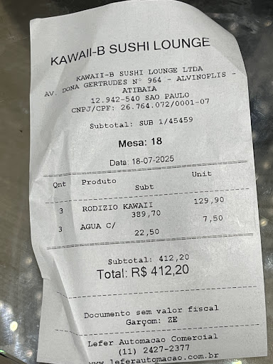 Obs: a dona não cobriu meu rodízio bariátrico pq eu só comi um sushi devido a demora, e a dificuldade não foi somente na nossa mesa,...