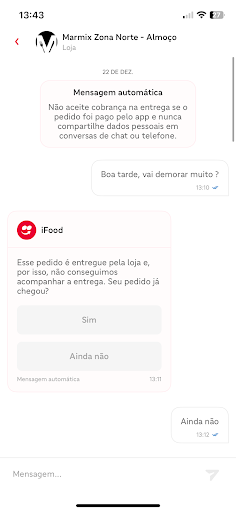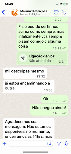 Read moreMINHA MÃE FEZ UM PEDIDO NA DATA DE HOJE POR VOLTA DA MEIO-DIA, VIA WHATSAPP, NA UNIDADE DE ITATIBA, PASSADO UM TEMPO ELA VIU QUE ESTAVA DEMORANDO PARA ENTREGAR E MANDOU MENSAGEM NO WHATSAPP PERGUNTANDO SOBRE A ENTREGA, UMA MOÇA MANDOU UM ÁUDIO DIZENDO QUE O MOTOBOY JÁ ESTAVA EM ROTA DE ENTREGA, MAS QUE ROTA DE ENTREGA É ESSA QUE NUNCA CHEGA??? ELA FICOU HORAS ESPERANDO UMA MARMITA QUE NEM RECEBEU!!!!