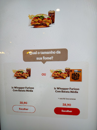 Read moreNão aconselho nesse local, vá a outro Burger King 24 horas. Foi o pior Burguer King que já fui. Fui muito mal atendido. Só havia um totem funcionando. No totem havia uma promoção no qual poderia pedir um whopper furioso + baconese + uma batata média. Ao entregar o pedido veio com batata pequena, eu informei que no Totem estava descrito batata média, eles simplesmente viraram as costas para mim. Tive que enfrentar uma nova fila no totem para tirar a foto de como estava descrita a promoção. Depois de muito resistirem, tipo fazendo questão de entregar uma batata média, finalmente trocaram a batata para mim. Posteriormente voltei ao totem para pegar um shake, porém o totem não estava funcionando mais, as pessoas que estavam na fila foram para o caixa, onde não havia ninguém atendendo, depois de aproximadamente 20 minutos esperando alguém atender, um dos atendentes disse que não poderia mais fazer o pedido pelo caixa e apenas pelo Totem, informaram que o totem havia voltado a funcionar, neste caso eu que era o segundo da fila, voltei ao totem sendo o último, esperei cerca de mais 20 minutos para conseguir comprar o shake. Não admiro as notas...