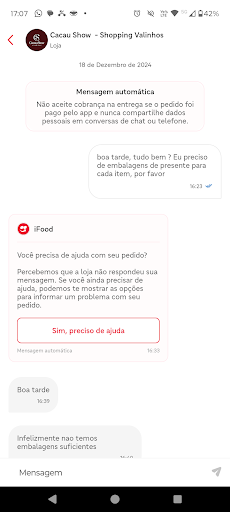 NÃO ENVIAM EMBALAGENS DE PRESENTE VIA IFOOD.