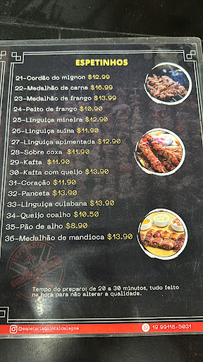 Os espetos que pedimos demoraram mais de 40 minutos para ficarem prontos. Eu e meu pai passamos muito mal, hoje é domingo e eu ainda estou tendo ânsia e indo ao banheiro várias vezes. Eu comi dois espetinhos, e o espetinho de linguiça cuiabana não consegui nem terminar pois estava esquisito e cru - acho que foi isso que nos fez mal. Resumindo, melhorem o atendimento de vocês, e sirvam coisas de qualidade. O ambiente é legal e estão em um lugar muito legal tbm,...