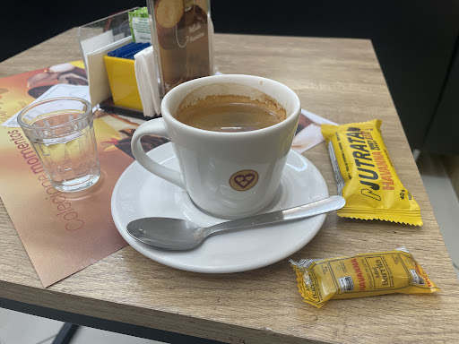 Pedi um café espresso e fui surpreendido com uma experiência completa: o sabor intenso e marcante do café, acompanhado de um copinho de água, uma barrinha Nutratta sabor Havanna e um mini alfajor irresistível.