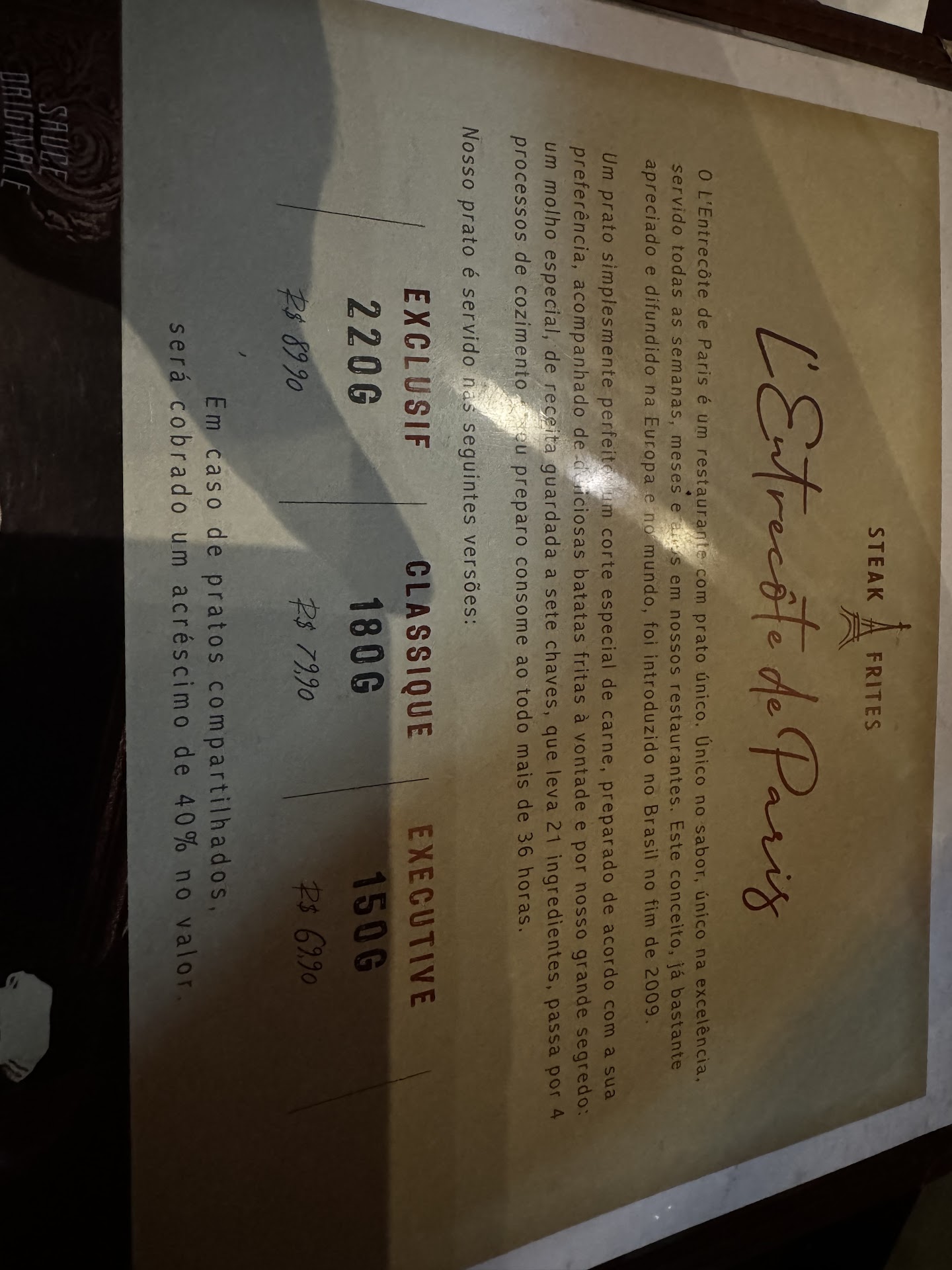 The portion of meat (150g) is very thin, I thought it was small, but it was ok. The meat was cooked just right, their regular cooking point is medium rare, the meat is very red in the middle, I loved the flavor. Very tender, very well made.