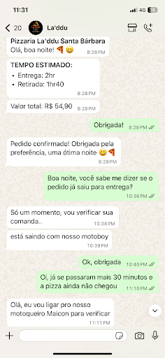 Read moreMeu pedido atrasou 1 hora do que informaram que seria, ou seja, mais de 2 horas para entrega. Entendo que atrasos podem acontecer, principalmente aos sábados, mas o mínimo de respeito e humildade, assumir o erro e pedir desculpas é o que esperamos, mas eles nunca se desculpam e ainda acham que tem razão. Me deixou 20 minutos sem resposta, pq entrei em contato já que não chegava e ainda só me responderam o nome do motoqueiro, como se isso resolvesse alguma coisa. Eles não tem respeito algum com o cliente. Não é a primeira vez que atrasam, mas a falta de respeito fez com que fosse a última, perderam um cliente. Não pelo atraso, mas sim pelo péssimo atendimento. O qual vi que não foi só comigo, várias avaliações com o...