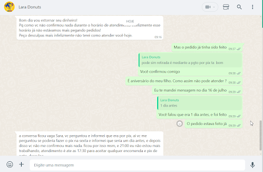 Olá, meu nome é Milena. No dia 05/05 (terça-feira), eu e meu namorado, Matheus, fizemos um pedido com vocês. Há um tempo estávamos sonhando em fazer um pedido, principalmente por gostarmos muito das verdadeiras rosquinhas estadunidenses e pela grande influência das belas fotos de suas rosquinhas nas redes sócias de vocês. No entanto, todas as vezes que entramos em contato por WhatsApp, o atendimento de descaso sempre nos limitou de concluir uma compra.