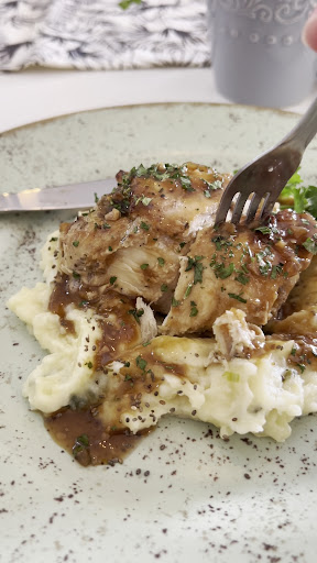 Depois, um prato purê de batatas com alho poró e um frango recheado de ricota e espinafre. E uma coisa bem da hora é que eles conseguem trocar a proteína. A Michas, por exemplo, trocou por peixe, dado que não come frango. E ainda vêm com uma sobremesa pequenina para adoçar a boca!