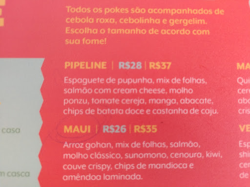 Opção ideal para o público fitness, a refeição no local tem como prato principal as saladas em estilo havaiano acompanhadas de proteínas que podem ser escolhidas entre salmão, atum ou frango. Há também prato para o público vegano e a opção de montar as saladas com os ingredientes ao gosto do cliente.
